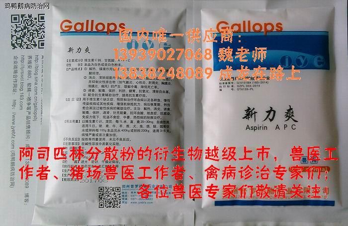 兽医临床必备用药--阿司匹林分散粉的衍生物即将上市,兽医工作者、猪场兽医工作者、禽病诊治专家们;各位兽医专家们敬请关注!畜禽低温不食症首选产品!下一代阿司匹林粉的替代品速溶速效“新力爽”新包装即将上市!敬请关注新力爽!到目前为止,阿司匹林已应用百年,成为医药史上三大经典药物之一,至今它仍是世界上应用最广泛的解热、镇痛和抗炎药,也是作为比较和评价其他药物的标准制剂(极溶于水的阿司匹林中国唯一供应商,13939027068魏老师;13838248089 成龙在路上)