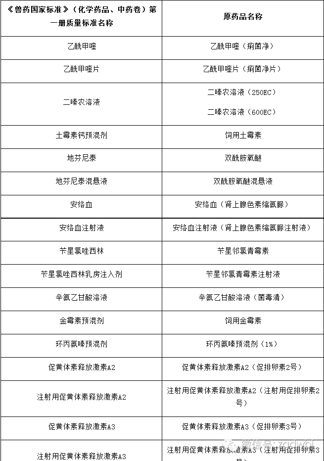 近期,部分兽药生产企业反映,因兽药通用名称调整,按原名称申请的兽药产品批准文号信息,与现申请兽药“二维码”载录的新名称信息不一致,造成信息核对偏差。经查,2013年中国兽药典委员会编制并由农业部发布实施的《兽药国家标准》(化学药品、中药卷)第一册,对部分兽药通用名称进行了调整(见附件)。各地在监督检查过程中发现附件所列兽药产品名称信息不一致的情况,请按同一产品信息进行确认。