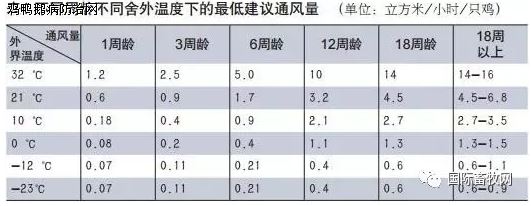 蛋鸡适宜温度范围为18-25℃,不同周龄不同舍外温度下的最低建议通风量见表1。