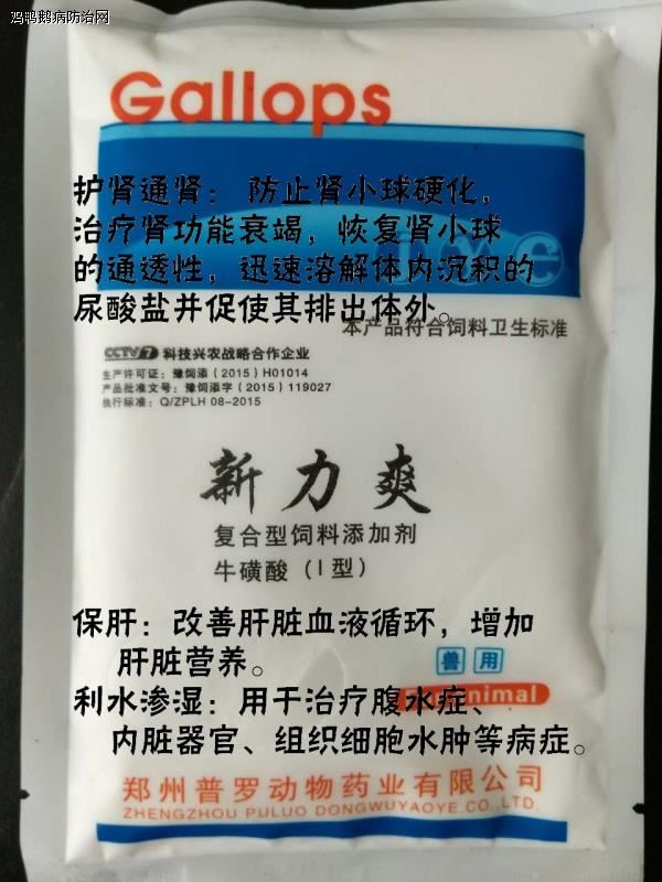 总体来讲,是药三分毒,咱们搞养殖也好,做技术服务也罢,还是应该把药当成养殖上面缺失的补救方法,而不是随意滥用。只有合理选择及使用,才能事半功倍。就拿通肾药来说,正常的鸡是不需要通肾的。但是不通肾不等于不护肾,保肝护肾是肉鸡养好的关键,比如现在过多的使用抗生素引起的肾脏损伤;饲料中的各种霉菌毒素引起的肝脏损害、肾脏损伤等,这些各种原因造成的损伤,需要的是修复、解毒、保护,如果再用上上边几种药物,不仅起不到好作用、还会加重病情。为此,鸡鸭鹅病防治网禽病实战专家魏老师历经数次临床验证、特别推出保肝护肾新药---新力爽(牛磺酸),主要作用是保肝护肾,对肝脏肿胀、易碎、肝脏发黄、有血泡、肾脏肿大高出肾窝、出血等有特效。合理使用保肝护肾药,您选对了