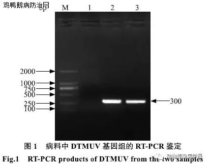 将长有80%单层DF-1细胞的T25细胞培养瓶用无菌PBS漂洗2次,加入900μL DMEM培养基和100 μL样品,混匀后置于含5% CO2、 37℃细胞培养箱感作2 h,每隔半小时晃动1次以使病毒感作均匀。2 h后弃去混合液,并用无菌PBS漂洗2次,最后加入5 mL含2%FBS的DMEM培养液,每隔12 h观察细胞是否出现病变。结果显示,病料接种DF-1细胞48 h后,细胞开始出现变圆、皱缩、聚堆等眼观病变,部分细胞脱落。60 h后,60%的细胞发生病变,收取出现病变的细胞上清进行RNA抽提、反转录得到cDNA,以cDNA为模板,利用DTMUV特异性鉴定引物进行PCR扩增,PCR产物经1%琼脂糖凝胶电泳,2和3泳道出现300 bp大小的特异条带,表明为病料中含有DTUMV,分别命名为ZJ201501和ZJ201504。