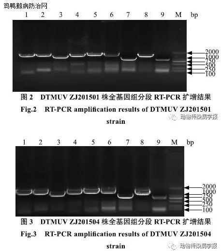 以鉴定为DTMUV阳性的样品ZJ201501和ZJ201504 cDNA为模板,9对两两互相重叠的引物进行PCR扩增,经1%核酸凝胶电泳分别得到了大小为1000-1500 bp左右的9条片段(图2和图3)。