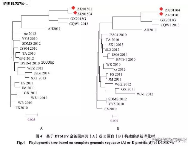 浙江省两个鸭养殖场中疑似鸭坦布苏病毒(duck Tembusu virus,DTMUV)感染的雌麻鸭卵巢病料,经组织研磨处理,DF-1细胞纯化,RT-PCR特异性扩增,成功分离了两株DTMUV,分别命名为ZJ201501和ZJ201504。利用全长分段RT-PCR扩增、序列测定、序列拼接方法成功得到2株病毒的全基因序列,并进行了系统进化树的分析。