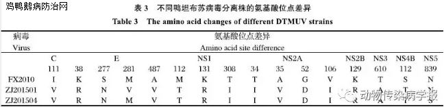 利用MegAlign软件进行序列比对,发现ZJ201501 和ZJ201504在ORF核苷酸水平上具有高达99.9%的同源性,仅有2个氨基酸位点的差异,分别位于E蛋白281位点和NS5蛋白839位点上。运用Mega7.0软件,以GenBank中选取的19条序列为参考序列,选取邻近法基于ORF核苷酸水平和E蛋白氨基酸水平进行系统发育树的构建(图4),ZJ201501 和ZJ201504位于同一个分支上,与其他DTMUV在ORF核酸和E蛋白上的同源性分别高于97.1%和98.4%,与2013年分离的GX2013G和CQW1的遗传距离较近,但与2010年分离的DTMUV-FX2010遗传距离较大。无论是从基于ORF核苷酸还是E蛋白构建的系统发育树来看,ZJ201501 和ZJ201504均与DTMUV-FX2010有较大的差异,进一步分析序列发现,共有16个氨基酸位点的差异,其在C、E、NS1、NS2A、NS2B、NS3、NS4B和NS5蛋白上分别有1、4、3、4、1、1、1和1个氨基酸位点差异(表3)。这表明,DTMUV随着年份的变化,其氨基酸发生了一定的变化,但该变化是否引起DTMUV的抗原性或对鸭子的致病力的改变还需进一步通过动物回归实验进行验证。