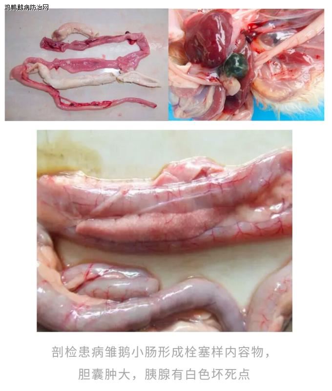 【剖解】:养殖场老板带来6只死鹅,解剖。病死鹅只出现胰腺出血、肠道淋巴滤泡肿胀,出现典型的“腊肠粪”,有轻微的浆膜炎症状。6只病鹅症状完全相同。