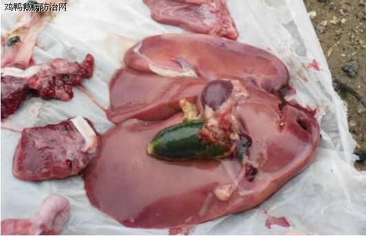 病鸭肝脏发黄,出现大理石状花纹,胆囊充盈,大部分成墨绿色,少量出现黄色透明。