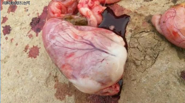 解剖症状:心包有积液,有腹膜炎,十二指肠粘膜出血;脾肿大,质脆,紫红色;肾肿大紫红色;胰腺出血或坏死,个别鸭心肌条纹状坏死,心内膜出血,肝脏上有纤维素渗出物附着,根据临床解刨症状疑似为鸭感冒继发的浆膜炎。