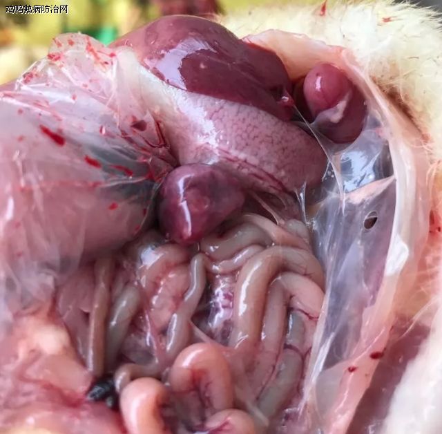 3) 雏鸭病毒性肝炎:传播迅速和高致病性传染病,死前有角弓反张等特征性神经症状,肝肿大,有出血斑点,末见有弥漫性坏死灶。
