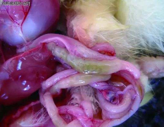 2) 雏番鸭副伤寒和伤寒:沙门氏菌引起,主要发生在3周龄以内的雏鸭,引起大批死亡,死前有神经症,肝脏肿大、红色或古铜色,表面有灰白色小坏死点,盲肠内有干酪样物质形成的栓子,抗生素控制有效。