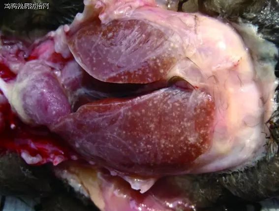 1) 肝脏肿大呈淡褐红色,质脆,表面有出血点或出血斑,表面和实质密布大量肉眼可见的大小不等,由针尖大到米粒大灰白色或灰黄色坏死点,甚至连成花斑样病灶,边缘不整齐 ,无光泽(图1)。