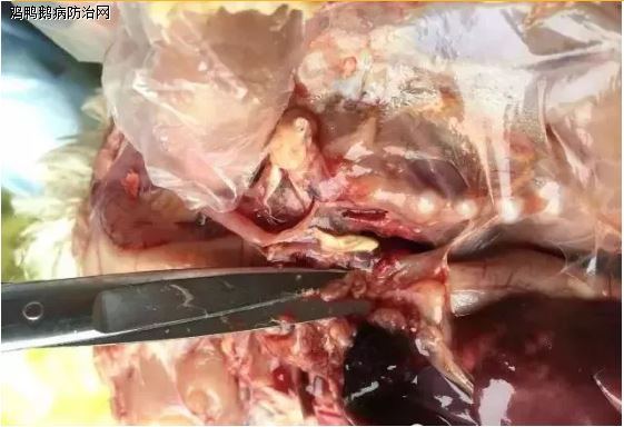 本病典型病变是在气管、支气管内形成黄白色的栓塞物,严重的延伸到肺内细支气管,这也是造成鸡高死亡的主要原因。