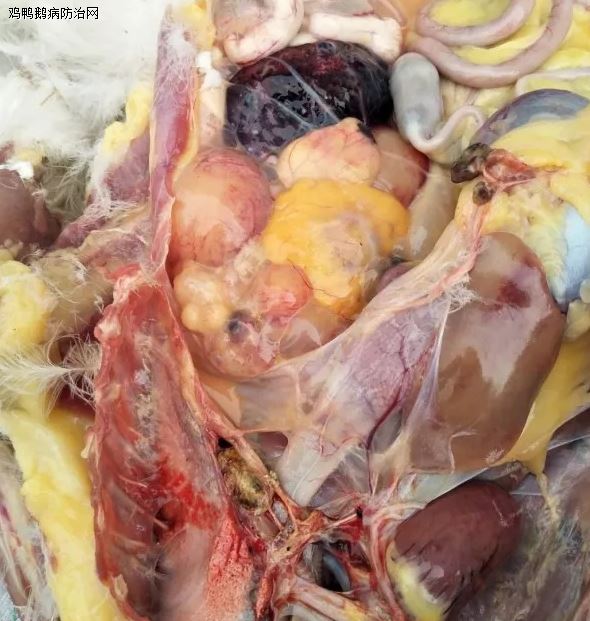 (4)母鹅表现泄殖腔、输卵管呈弥漫性充出血并有大量粘脓性液体,肠管相互粘连,腹腔内有大量破溃的卵蛋液。卵巢、卵泡弥漫充血,卵膜簿而易破,卵泡呈暗紫色,部分皱缩或呈菜花样。