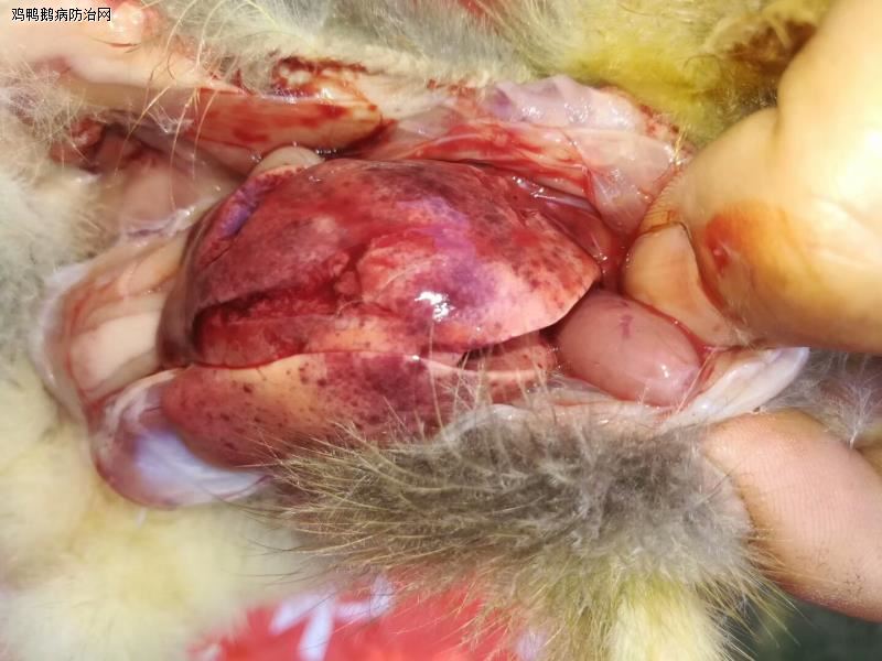 诊断要点:突然发病,发展迅速,濒死鸭运动失调,身体倒向一侧,似游泳状,死亡鸭呈角弓反张姿势。成年鸭不易感染。剖检病变主要见肝脏肿大、质脆呈土黄色,表面有条状或点状新鲜出血点或血斑。如图一所示: