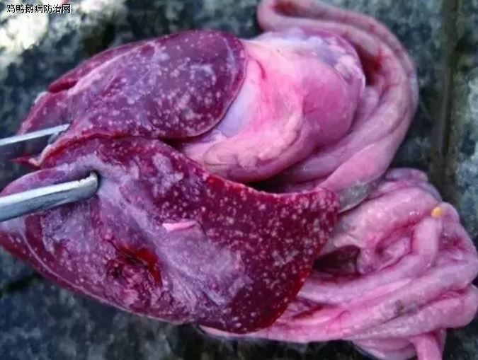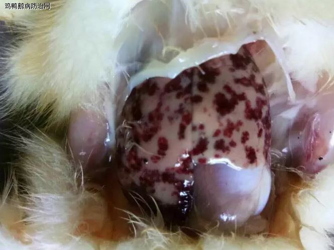 诊断要点:雏鸭怕冷,常挤成一堆,番鸭精神委顿,全身乏力、脚软或拐脚。肛门周围有白色或淡绿色稀粪。剖检见肝脏、脾脏肿大或稍肿大,表面和切面有弥漫性、大小均匀、灰白色坏死点,脾脏的白色坏死点比肝脏上的白点略大,发病后期雏鸭见心包膜严重。成年鸭未见发病。如图二所示: