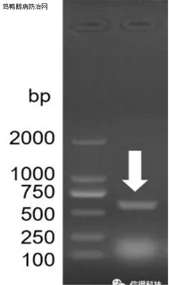 取鸭心、脾、肾、法氏囊、肝、肺、胰、胸腺,研磨处理,离心取上清提取DNA。利用小鹅瘟特异性引物进行PCR扩增,结果如图所示:检出小鹅瘟。