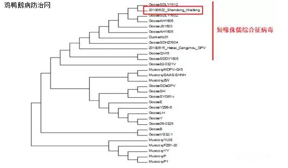 陈少莺等对福建半番鸭进行研究,血清学结果显示,发病鸭或耐过后鸭血清中的抗GPV抗体明显高于抗MDPV抗体,IFA试验也显示病鸭的肝脾组织不能被抗MDPV单抗识别,但是能被抗GPV单抗特异识别,且呈现亮绿色强阳性荧光,PCR产物的核苷酸序列与GPV的同源性为96%,明显高于与MDPV的同源性81%,因此认为该病病原为一种新型小鹅瘟病毒(NGPV)或GPV变异株。