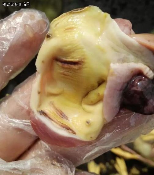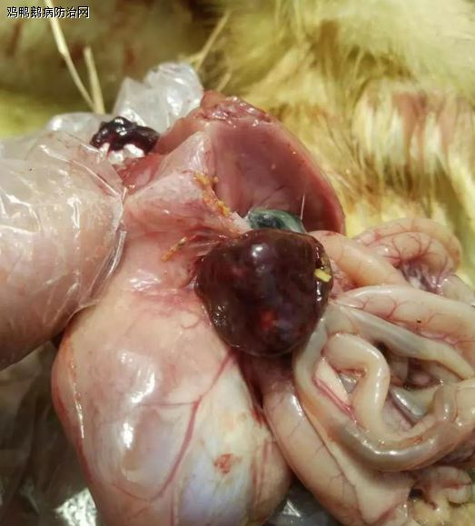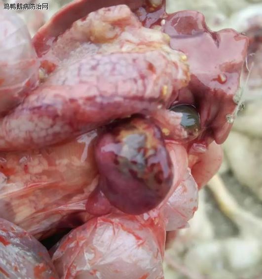 剖检症状:除具备典型的脾坏死症状外,气囊和肺组织实质性硬变和纤维化坏死,肝肿大发绿,胆囊充盈。腺胃粘膜出血,肌胃、十二指肠、心脏等多处有黄色胶冻样渗出物等。
