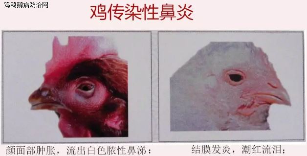 发病初期,鸡群采食量下降,有部分鸡只出现流泪,眼眶积聚泪泡,打喷嚏,甩鼻,鼻孔流稀薄黏液等现象,随着病程的延长,一侧或两侧的鼻窦部肿胀,眼睑浮肿,鼻孔流黏稠分泌物,干燥后结成黄色脓痂,有难闻的臭味,呼吸困难;后期出现下痢,拉黄绿色稀粪,产蛋率下降20%左右。