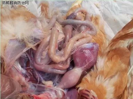 图1:腺胃肿大,肠管一段粗一段细,肠壁变薄,肠粘膜脱落。腺胃肿大,必定是腺胃炎;目前霉菌性腺胃炎占腺胃炎病例的95%,其次5%是病毒传染性腺胃炎。
