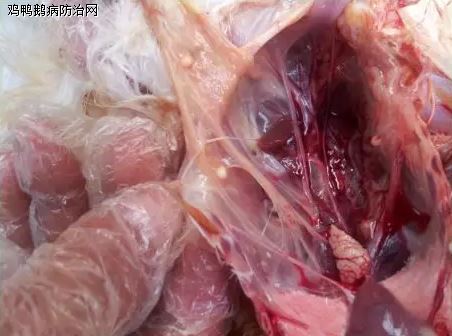 图3:部分鸡腹壁上有较多结节,判断是否是霉菌病病变,主要特异性病变是椭圆形、界限明显可剥离结节性病变。
