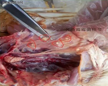 图2:腹壁上有黄曲霉菌解决,椭圆形、可剥离的结节。
