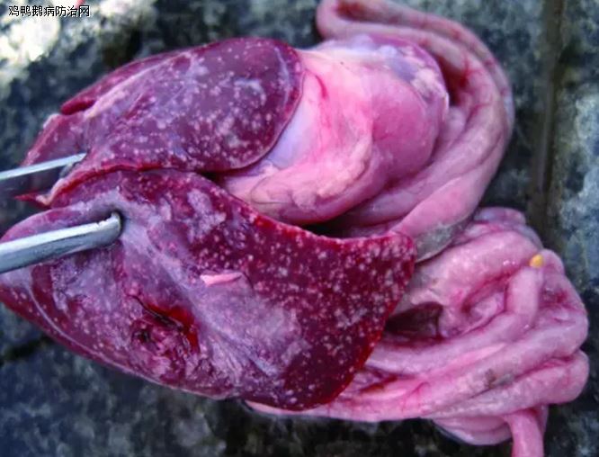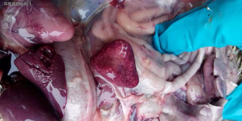临床症状:心内、外膜出血,脾脏肿大、有白色斑点坏死,卵泡液化、破裂,卵泡膜充血、出血,回肠中部淋巴组织集中处黏膜发生灰白色卵圆形肿胀。