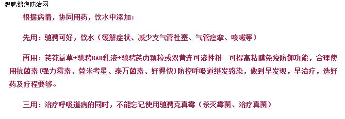 驰骋种禽疫病研究所针对当今呼吸道疫病的发生特点与发病原因,为其精心设计了一个综合防治方案: