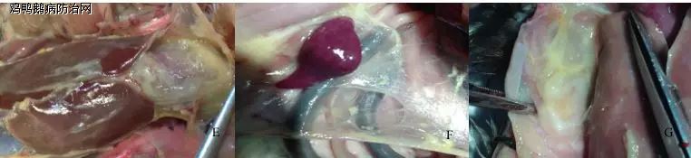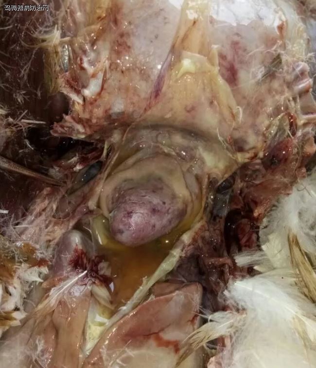 心包炎,心包严重粘连,心脏表面有纤维素性、干酪样渗出物;肝周炎,肝脏肿大,表面有一层半透明状灰白色的纤维素性膜,此膜容易剥离;气囊炎,气囊壁增厚,浑浊,不透明,表面有纤维素性渗出物;有时个别病例腹腔积液,脾脏肿大,表现有灰白色坏死斑点;部分病例肠道充血出血,以十二指肠最为严重,肠黏膜表面有黄色胶冻样分泌物,直肠处可见白色或浅绿色稀粪;患鸭有神经症状时,可见纤维素性脑膜炎,脑膜充血出血。