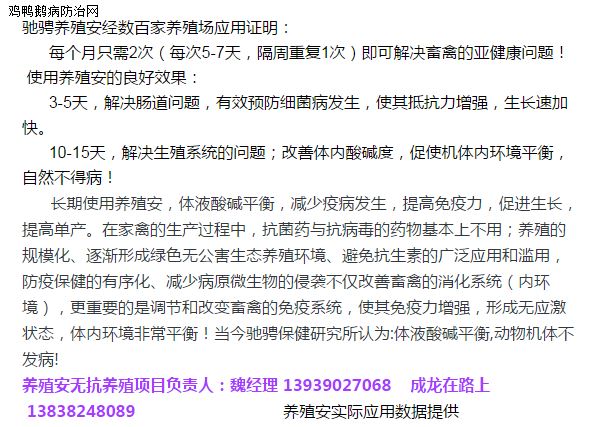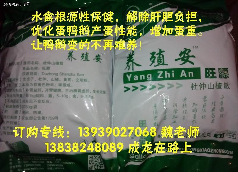 中药汉方+微生物保健---养殖安I(绿色自然健康,无抗养殖首选)-高效复方杜仲提取物+嗜酸乳杆菌+枯草芽孢杆菌+酵母菌(含酵母细胞壁)+益生元(寡糖),国家一类新型功能性添加剂。家禽根源性保健, 解除肝胆负担,彻底摆脱肠道疾病的困扰!优化蛋鸡产蛋性能,增加蛋重。让鸡变的不再难养!养殖安是畜禽肠道保护专家;家禽与水禽的肠道有两大功能,一是消化功能,第二就是免疫功能。肠道功能不好的话,那么免疫功能也就不存在了。正所谓“皮之不存,毛将焉附”。不采取措施缓解应激效应、维护动物的消化道功能,势必会出现健康等问题,抗生素的使用也就在所难免了。实际上,如果能够做到减少动物的应激,改善动物的消化道功能,是可以做到不用或少用抗生素的,这是我们通过众多的科学研究和生产实践所证实的结论。事实胜于雄辩!