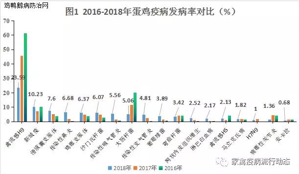 我们通过近三年疫病发病概况分析,可以看到部分疫病发病情况,通过数据了解三年来蛋鸡疫病发病率差异及趋势。图1为2016年到2018年间蛋鸡部分疫病发病率对比:
