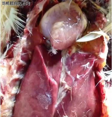 2中期:咳嗽症状会更加重,而且大群会有拉稀症状,有减料的现象,吃料时,有部分鸭子屁股会耷拉,而且又脏又湿,个别出现死亡,出现日龄在大约在23天以后,剖检会发现心包积液的情况,个别的包心不包肝。