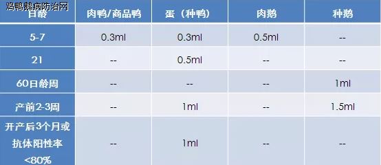 目前常用的疫苗有坦布苏活苗和灭活疫苗两种。活苗虽然价格便宜,使用方便,但是活苗保护周期短,种鸭种鹅免疫会导致病毒垂直传播给下一代,同时存在毒力返强、散毒风险,导致蛋鸭、种鸭、种鹅等产蛋随迁开产推迟15-20天以上,临床使用可能导致水禽免疫抑制;育成鸭鹅免疫后易出现瘸腿现象,商品代骨骼发育障碍,易出现侏儒鸭鹅。