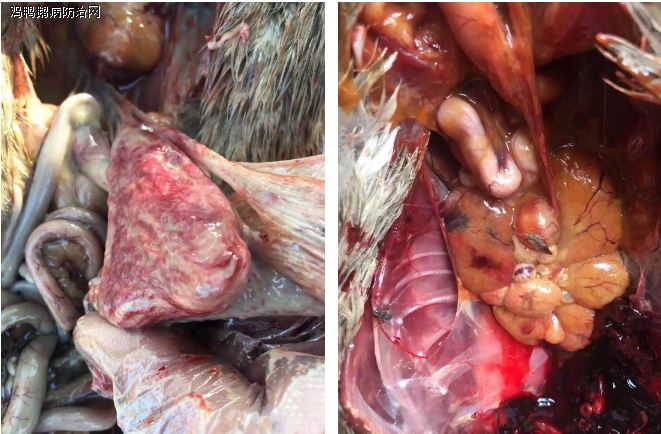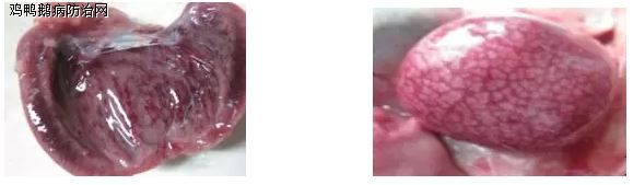 发病鸭鹅颅内水肿;淋巴滤泡肿胀;脾脏肿大坏死,色泽变暗;脑膜呈树枝状出血;心肌发软,心脏呈扁圆形,心内肌出血;心脏呈煮熟样