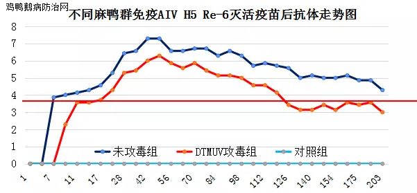 80日龄麻鸭,攻毒剂量0.5ml/只,83天接种禽流感疫苗(H5 Re-6)1ml/只,胸肌注射。