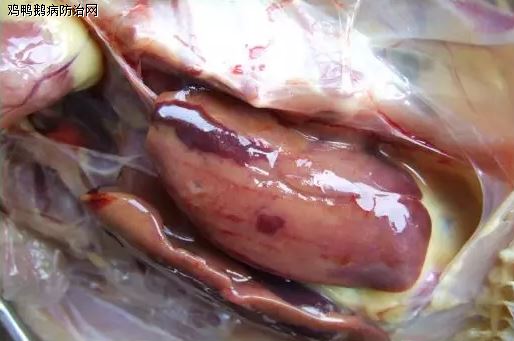 病理变化:死鸡冠脸发白,解剖以肝破裂出血为主要病变,肝脏易碎,多数腹腔有多量的脂肪块,肠内气体较多,其他器官无典型病变。