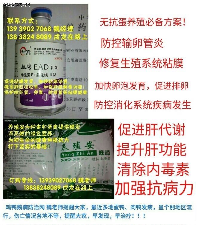 2、定期养殖安+驰骋EAD乳液 每月五至七天 不仅是针对本病,而是对蛋鸡、种鸡产蛋期较全面的一个保健措施