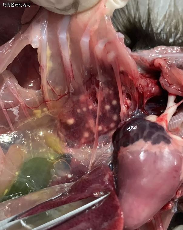 解剖症状:两棚养殖,A棚病鸭表现为多数脾坏死,表面有明显的白色坏死灶,干硬,肝脏有白色坏死,气囊,特别是龙骨内缘有黄色干酪样,心脏心冠脂肪弥漫性出血。B棚病鸭肺脏明显有黄白色圆球状结节,几乎所有气囊有少量黄色干酪样附着,脾脏渐进性坏死,股骨头坏死,肾脏出血,消化道内没有食物。