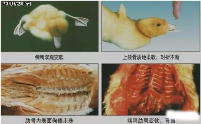 雏鸭和育成鸭的喙部色淡、变软,腿部的长骨(股骨、胫骨)质薄而软,骨髓腔变大。有些长骨质脆变弯,形成“O”形腿,跗关节或骨端粗大。病程长的肋骨骨端与胸骨(或肋软骨)的结合处,呈白色结节状肿大,如串珠状。成鸭喙及胸骨变软,肋骨、胸骨和椎骨接合部内陷,所有肋骨沿胸廓呈向内弧形的特征。
