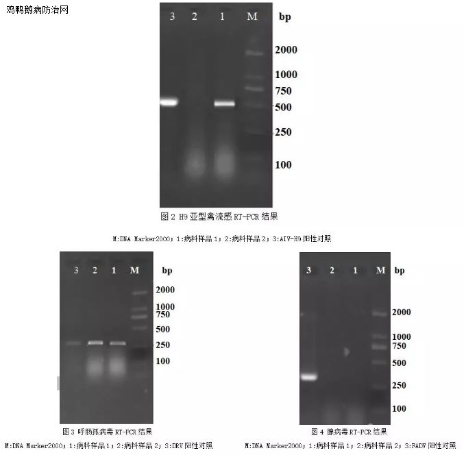 根据鸭群的临床症状、解剖病理变化和免疫背景分析,初步诊断为H9亚型禽流感感染,继发有细菌病。不排除混合感染有腺病毒、呼肠孤病毒等其它病毒。采集病、死鸭只病变肝脏、脾脏、胰腺肺等组织,送实验室做PCR/RT-PCT鉴定H9亚型禽流感(AIV-H9)、腺病毒(FADV)和鸭呼肠孤病毒(DRV)。同时采集鸭群血样,送实验室分离血清,做AIV-H9抗体检测。