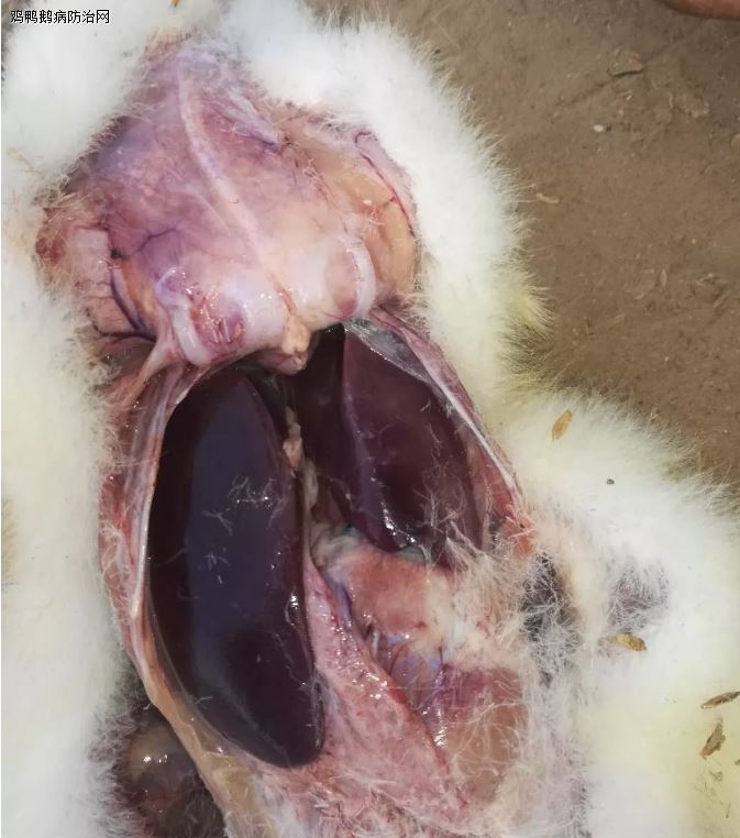 小鹅解剖肝脏发黑,有金属光泽,拉白色稀便。