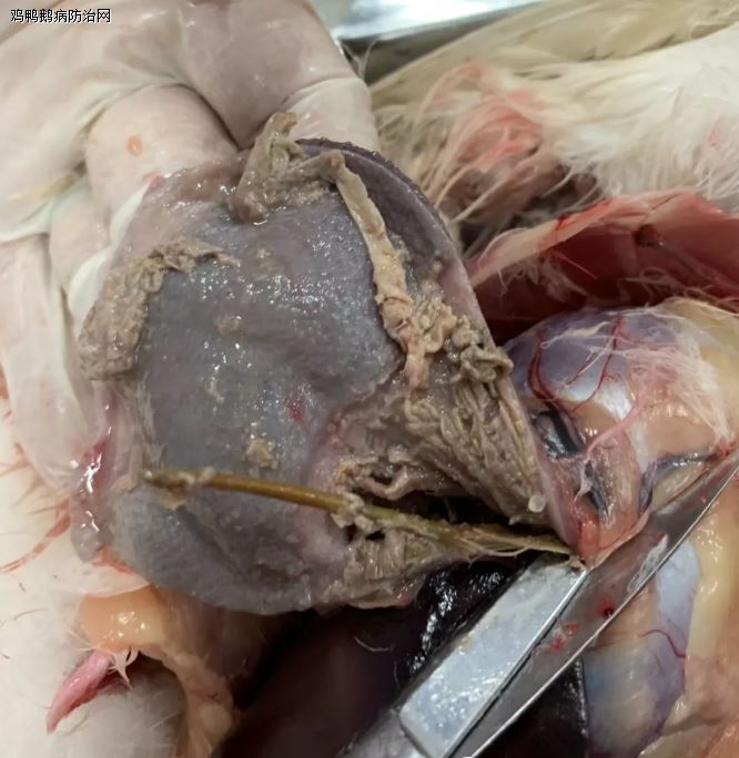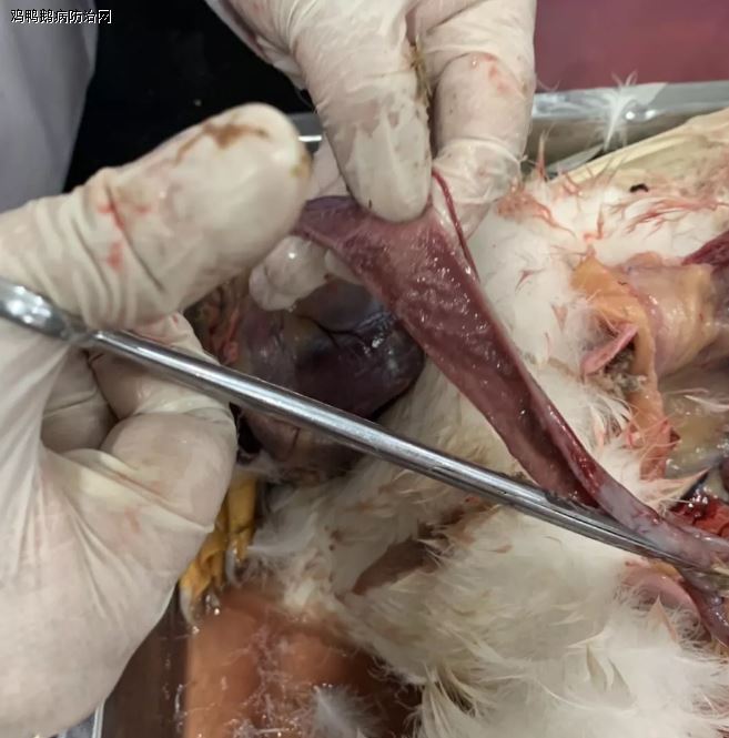 剖检病死鹅发现, 主要病变在食道、肌胃、空肠和回肠段, 肠管褪色和肿胀, 严重者可见整个空肠和回肠充满血样液体。肠内充满恶臭气体, 空肠和回肠黏膜增厚, 其表面附着一层腐竹伪膜 (纤维素性渗出物和坏死的肠黏膜) , 肠内容物混有血液。个别病例气管有黏液, 喉头出血。卵巢萎缩、明显可见菜花样卵泡。脾脏肿大呈紫黑色。