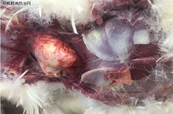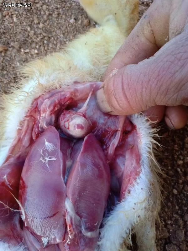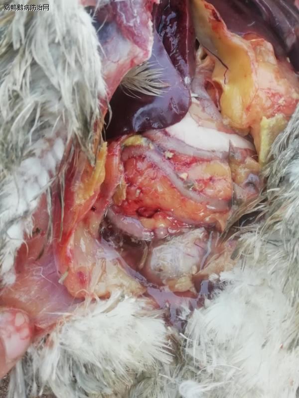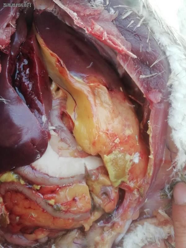 通过对死亡之后的鸭子解剖我们可以看到腹腔内有大量血水,心脏表面有黄白色纤维素渗出物,肝脏肿大、质脆,呈土黄色,一个大一个小,表面有淡黄色纤维素渗出物,形成厚薄不均、较易剥离的纤维素膜。胆囊充满胆汁。胸腺、法氏囊明显萎缩,体积变小。肾脏充血肿大,色暗红。