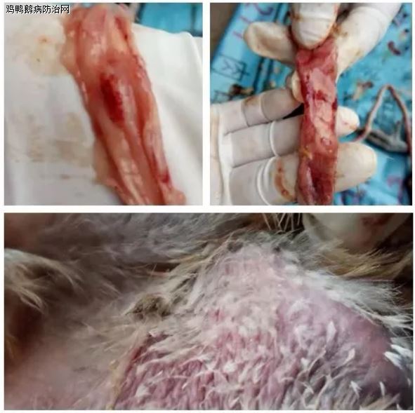 27客户:44天麻公,每天死亡10只,解剖症状如下图,气管上的干酪物刮不掉。