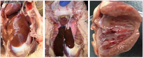 蛋鸭和种鸭的主要病变出现在卵巢,表现为卵巢出血、坏死和萎缩,输卵管有白色酪样渗出。肉鸭雏鸭多数病死鸭肝脏肿大,颜色发黄;脾脏肿大、严重可见脾脏破裂,有时呈大理石样;心肌苍白,有时可见白色条纹样坏死;胰脏针尖白色坏死;部分脑膜出血、充血。大日龄肉鸭可能会出现肝脏、脾脏萎缩的情况。