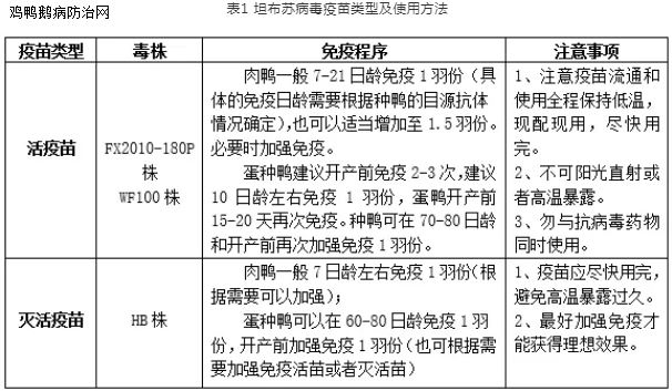 该病目前尚无有效特异性治疗药物,但疫苗效果确实。目前商品化的疫苗有WF100株弱毒疫苗、FX2010-180P株弱毒活疫苗以及灭活疫苗(HB株)。肉鸭使用减毒活疫苗一次免疫可产生良好免疫保护,种鸭最好免疫两次。也有活疫苗和灭活疫苗组合一起的实践方案(具体使用方法见表1)。该病在发病早期可采用活疫苗紧急免疫,也可采用抗体进行紧急治疗,能够迅速减少死亡。但发病后期再进行治疗通常效果不理想,但活疫苗紧急免疫能够缩短恢复时间。