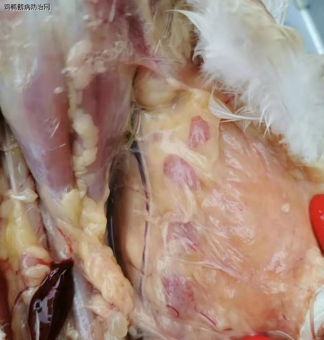 被毛无光,眼睛凹陷,心冠脂肪和心内膜有出血点,心包积有黄色液体,脑膜充血和出血,肝脏、肺脏、脾脏和肾脏有不同程度的出血, 胰腺充血、出血或有灰白色坏死点,小肠、盲肠扁桃体和泄殖腔充血出血。