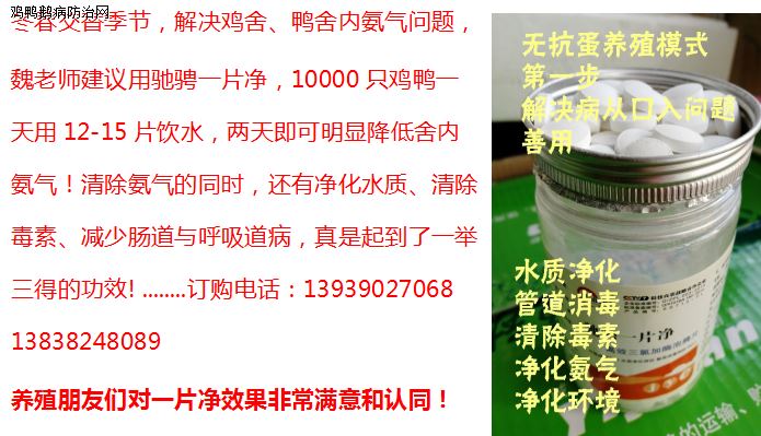 1、改善水质、清除毒素、净化养殖环境:用驰骋一片净,每周三定期消毒一次,即可达到净化养殖环境目的(祛除棚舍氨气、空气净化首选--驰骋一片净(减少呼吸道疾病传播))。经过数百家养殖企业使用证明:选用驰骋一片净,消毒效果好!对多种病毒、细菌、真菌有效率达93%-98.5%。畜禽养殖防控肠道病好用、有效、实惠、方便、便宜等特点的产品--驰骋一片净(3000只鸭鹅1天只需10-15片驰骋一片净即可解决病从口入)老养殖朋友都在用,您还在等什么............