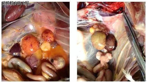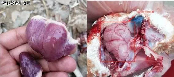 蛋鸭:解剖主要病变可见卵巢发育不良、卵泡变性、变形、坏死或液化,卵泡膜充血、出血。有神经症状的病死鸭还可见脑膜出血,脑组织水肿,呈树枝状出血。