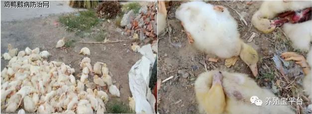 安徽某集团樱桃谷肉鸭场,全场存栏为2.4万羽,3层笼养。发病鸭群日龄为15日龄,发病前,每棚日死淘率5只左右,17日龄后每天死亡180只左右;养殖户反映,由于上批鸭子早期通风量小造成很多鸭子翻个,本批鸭子加大了通风,造成鸭子受凉。我们接诊时间是在鸭子20日龄时。鸭子主要是高热不退、摇头晃脑、脱水严重不能站立。