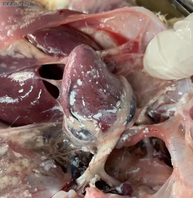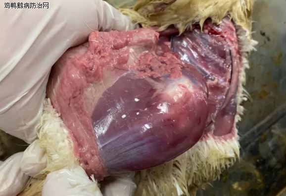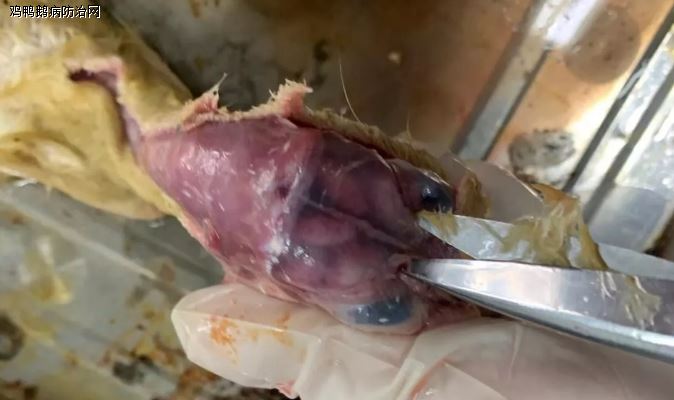 剪开锁骨、胸骨,沿胸部中线,一直到肛门打开,双手向双侧按压,整个胸部、腹部敞开,心脏、肌胃、气囊、肾脏,全部是尿酸盐,脑膜,包括骨头缝隙全部是石头粉。